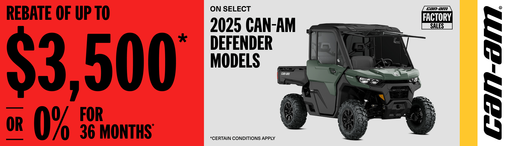 Rebate of up to $3,500 or 0% for 36 months on select 2025 Can-Am Defender models