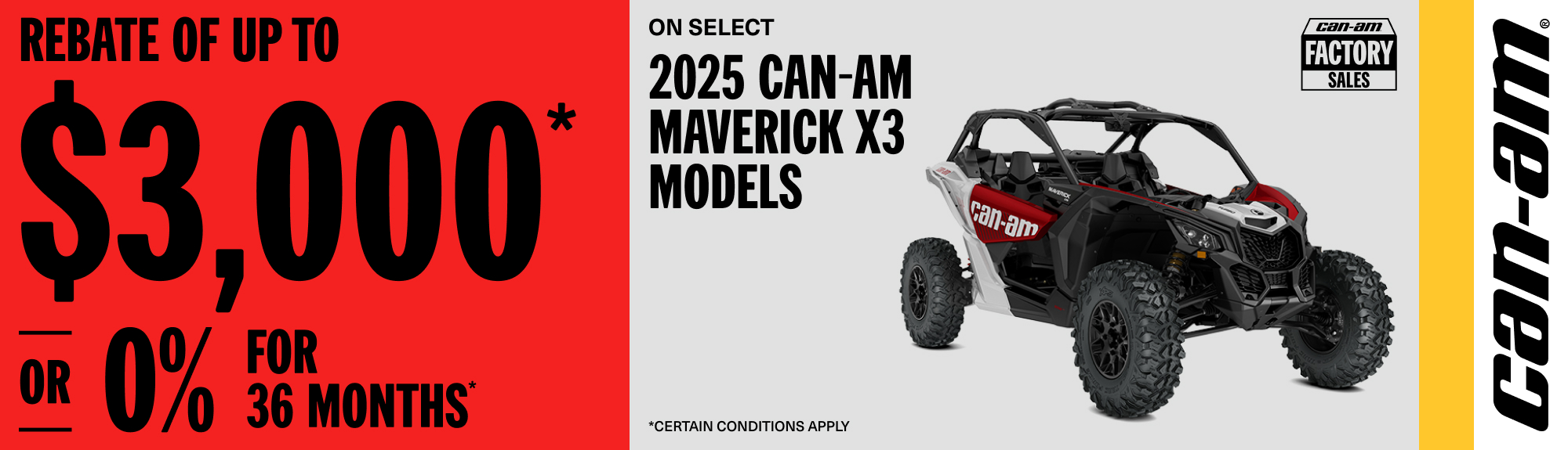 Rebate of up to $3,000 or 0% for 36 months on select 2025 Can-Am Maverick X3 models