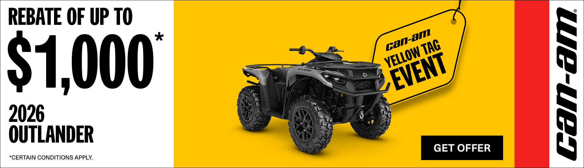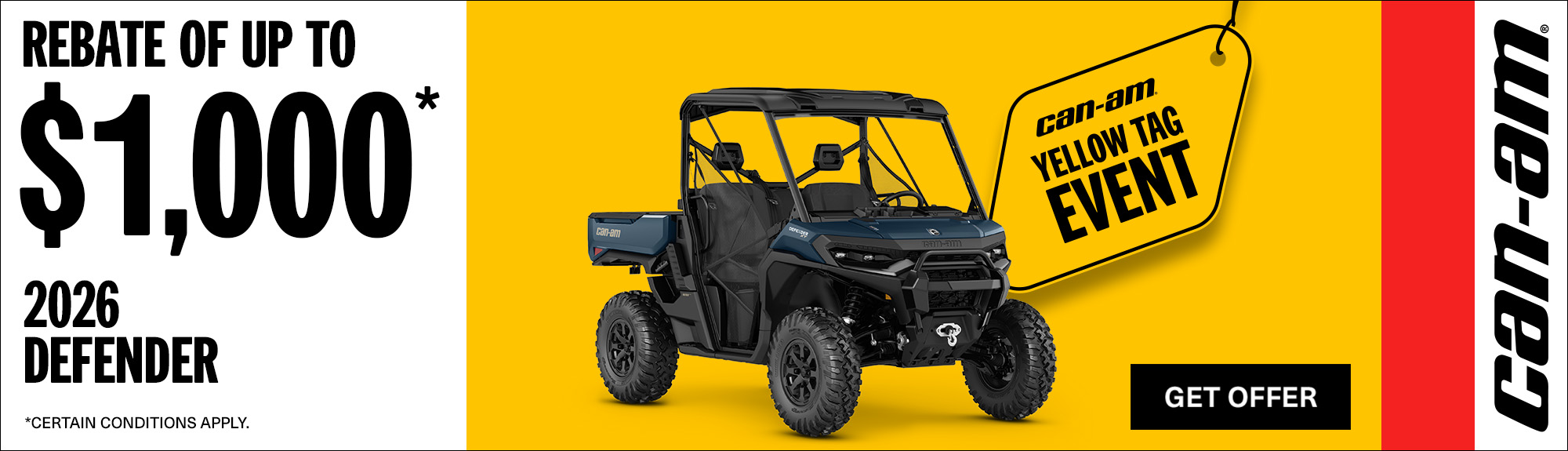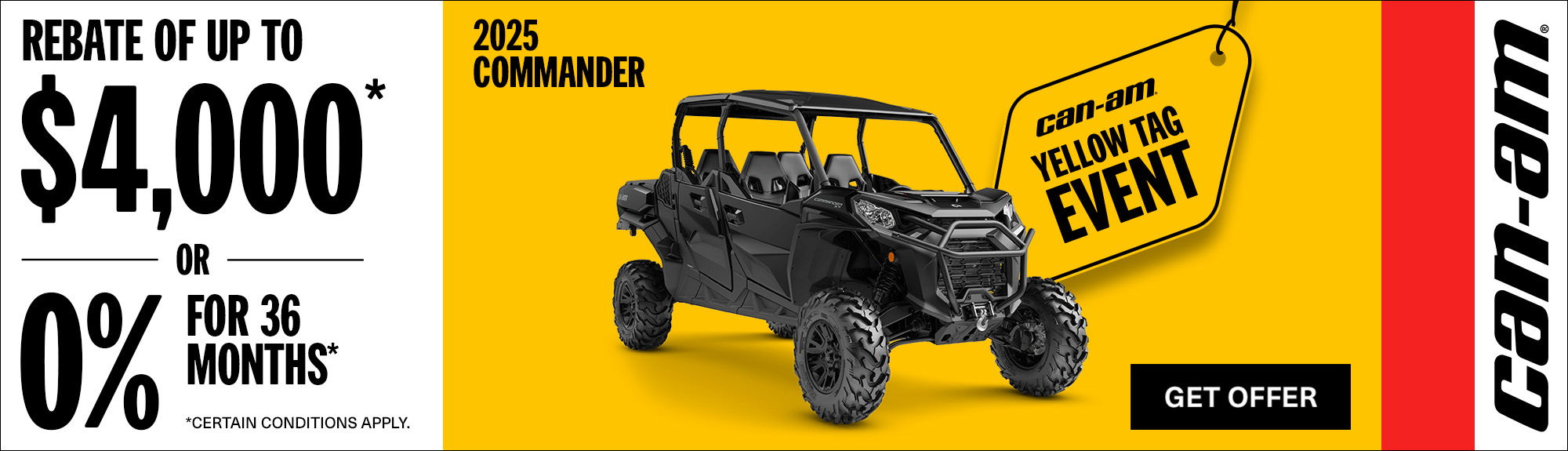 "©2026 Bombardier Recreational Products Inc. (BRP). All rights reserved. ®, ™ and the BRP logo are trademarks of BRP or its affiliates. In the U.S.A., products are distributed by BRP US Inc. Offers valid in U.S.A. only from March 1, 2026 to April 30, 2026. The conditions may vary depending on your location and this offer is subject to termination or change at any time without notice. This offer is not refundable, exchangeable or transferable (including from one dealership to another), cannot be redeemed for cash, credit or other products of equivalent value. Null where prohibited by law. Until supplies last. Eligible units for the announced rebate are all new and unused 2025 Commander 1000R, Maverick Sport and eligible units for the announced promotional financing are all new and unused 2025 Commander 1000R, Maverick Sport, Defender DPS CAB HD9 models. Other Can-Am off-road models may qualify for rebates or promotional financing, see local dealers for details.