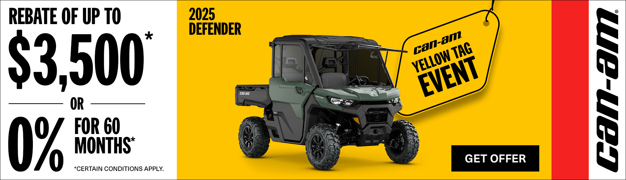 Rebate of up to $3,500 or 0% for 60 months on select 2025 Can-Am Defender models