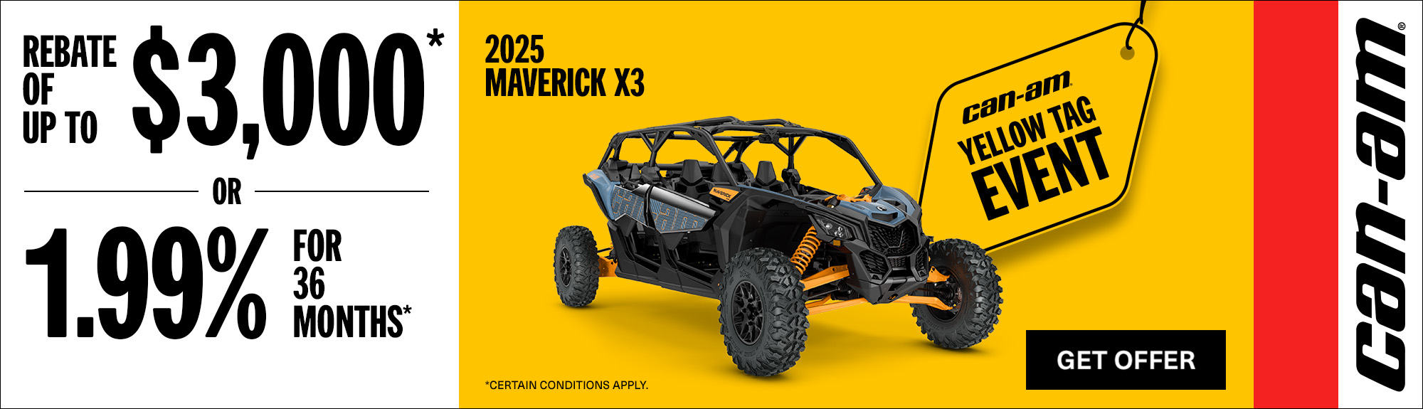 Rebate of up to $3,000 or 1.99% for 36 months on select 2025 Can-Am Maverick X3 models